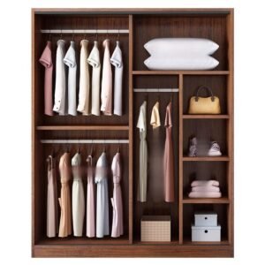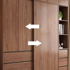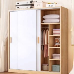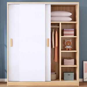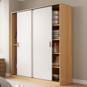 Simplistic Timber Wardrobe with Interior Shelves, Clothing Rod, and Slipping Mechanism