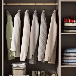 - Upgrade your wardrobe with this smart armoire. Enjoy organized interior shelves and a handy hanging rod, all behind a smooth soft-close door. Perfect for your daily rhythm.