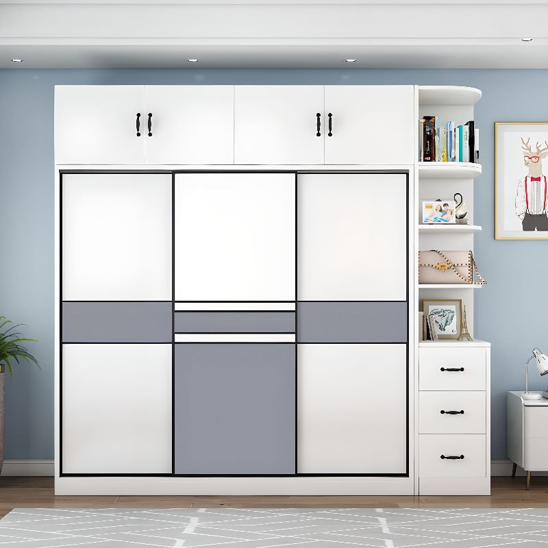 Chic All-White Sliding Door Wardrobe with Integrated Side Drawers – Magnificent 79″ to 94.5″ Modular Storage in 18 Styles