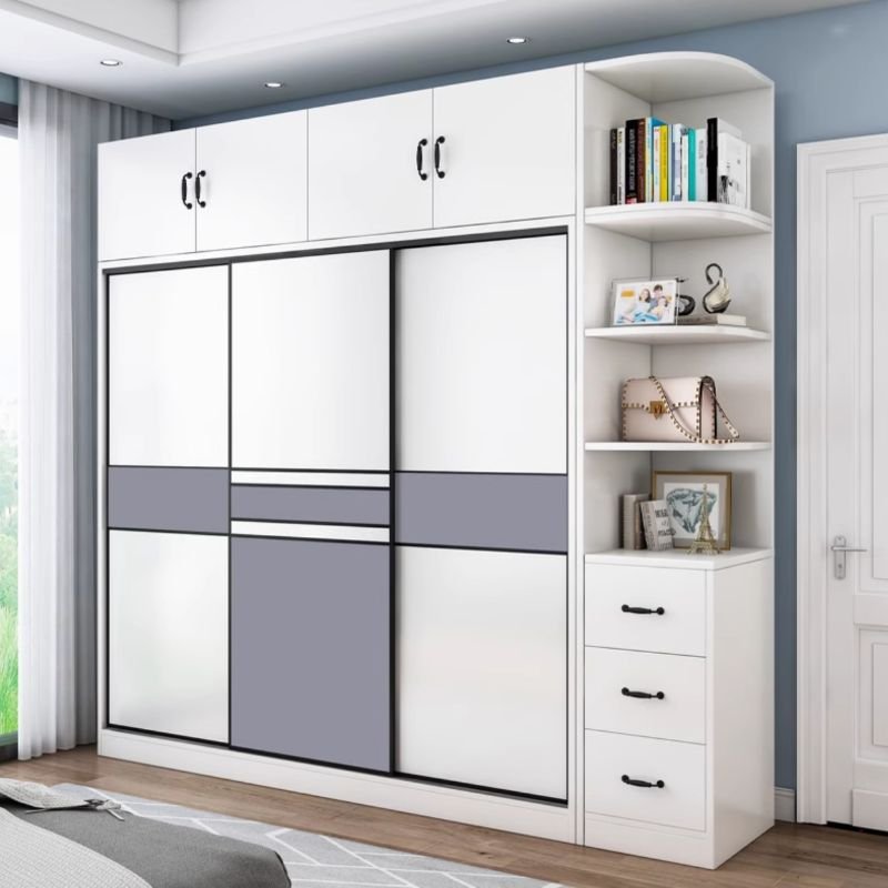 Zonal Intelligence: The Integrated Side-Drawer Storage System Sophistication lies in the details of daily rituals. The SD016 is designed with an Integrated Side-Drawer Storage System that provides a dedicated zone for life’s finer essentials. Unlike standard wardrobes, this model includes a side cabinet configuration with drawers and open shelving. Each drawer is fitted with our signature industrial-grade buffer rails, ensuring a glide that is as quiet as it is smooth. Whether it is for jewelry, watches, or intimate apparel, the handle-equipped design provides a tactile sense of quality. By utilizing sliding tracks for the main doors, we save critical floor space, a “Space-Saving Luxury” that is essential for modern master suites.