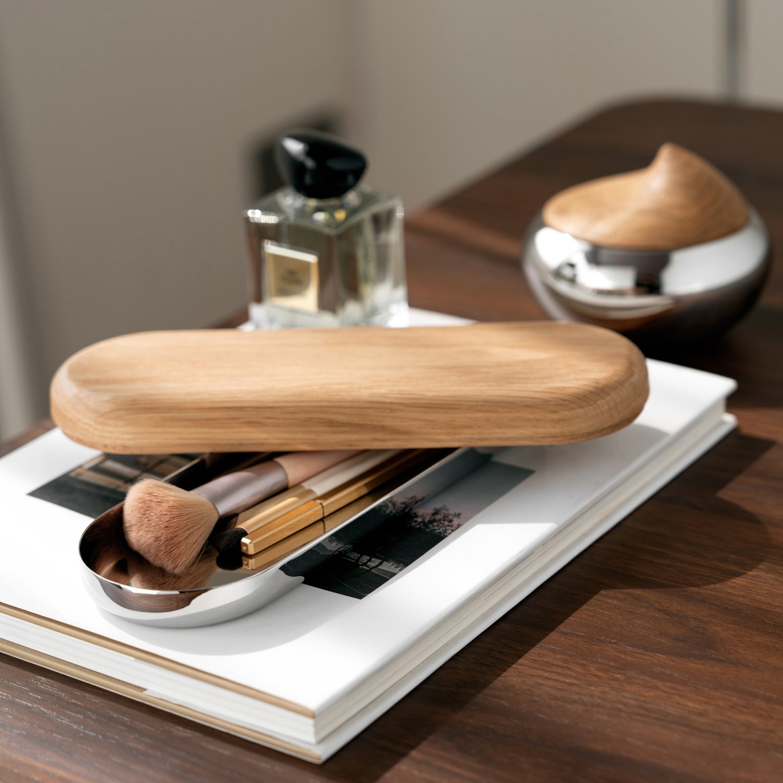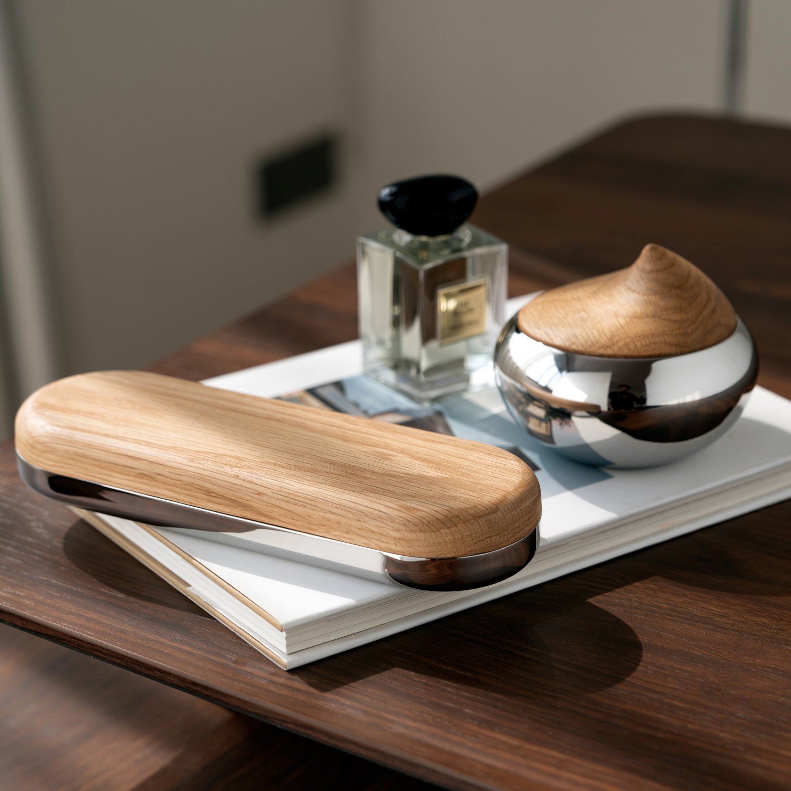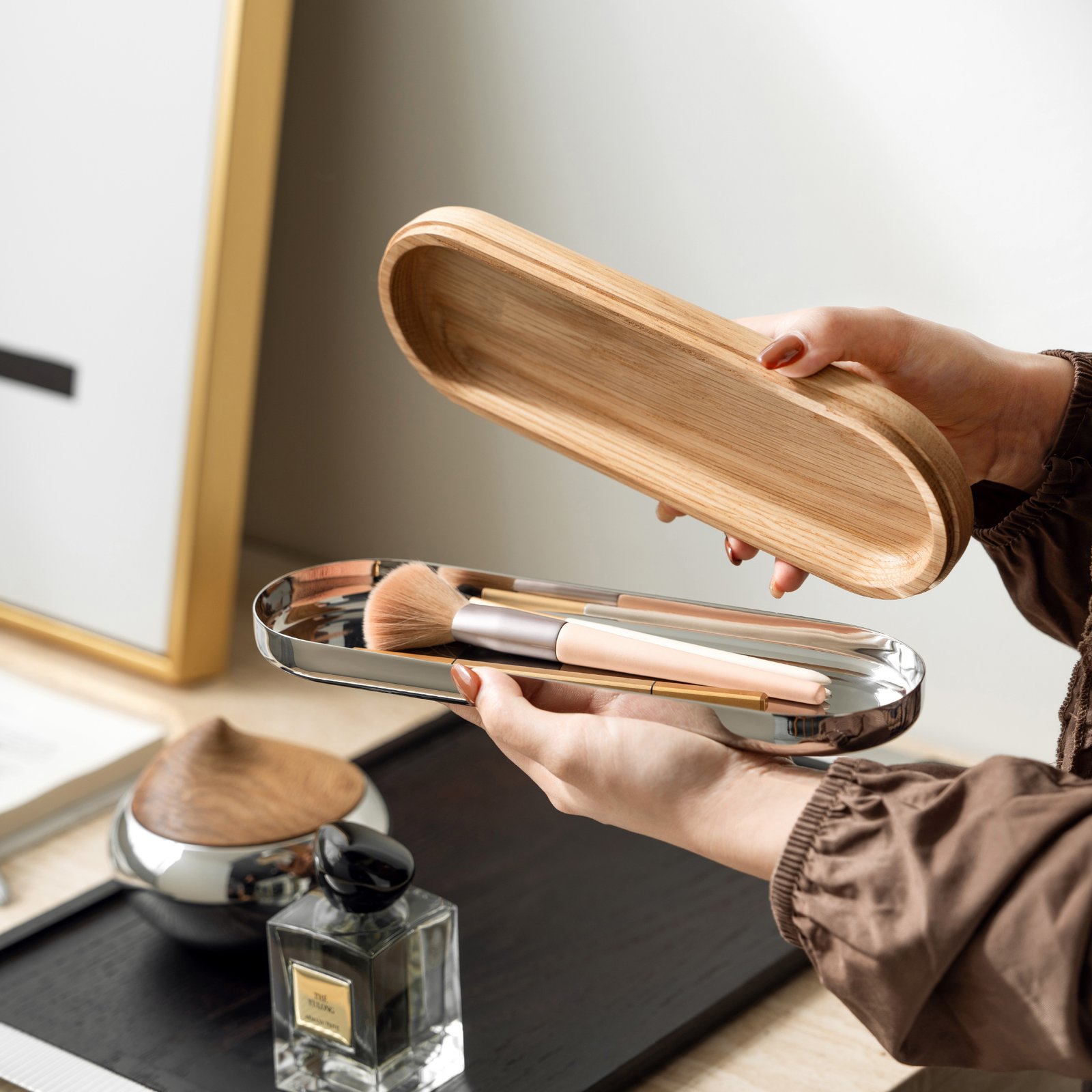 Creative stainless steel wooden desktop storage box, pen box, exquisite jewelry box, earrings, necklaces, high-end jewelry box ornaments