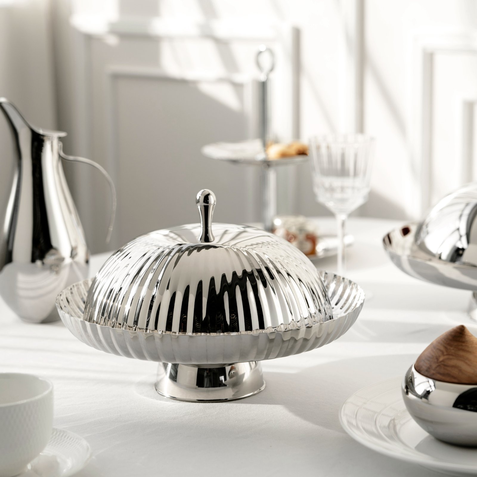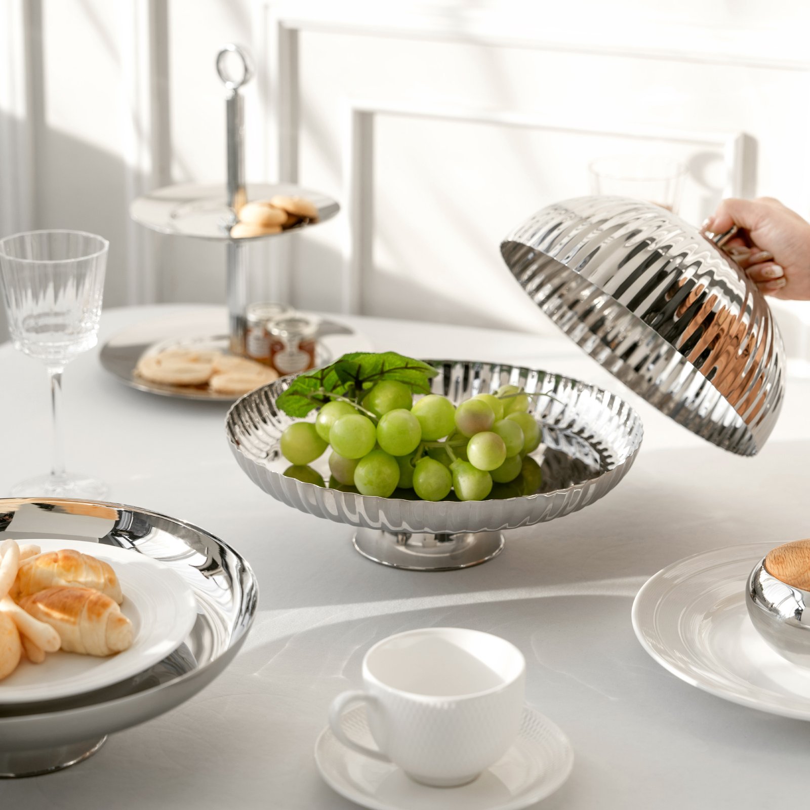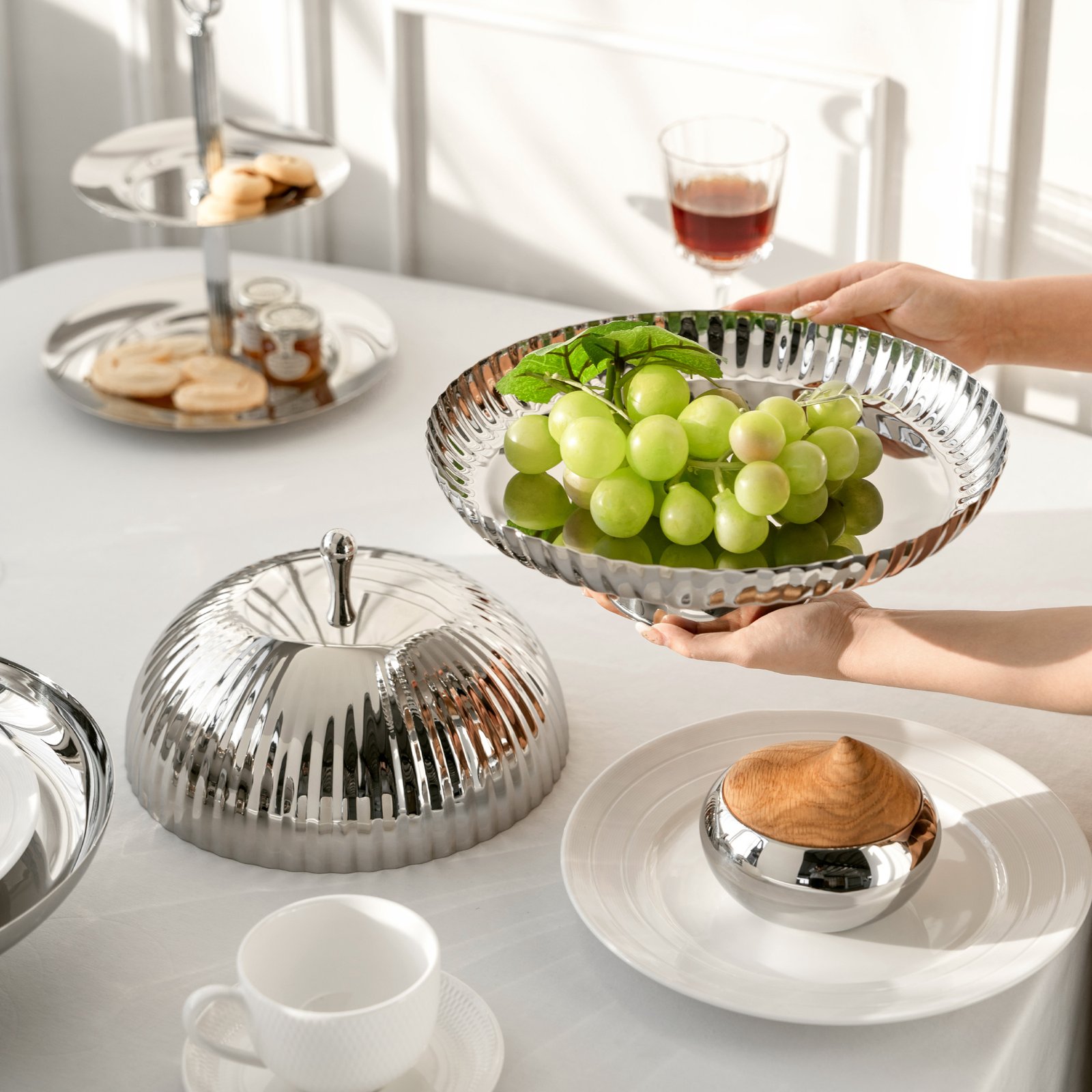Creative style stainless steel light luxury striped dining lid, storage pocket, cake plate, fruit plate storage pocket, coffee table, dining table, snack plate, fruit basket, home decoration ornaments