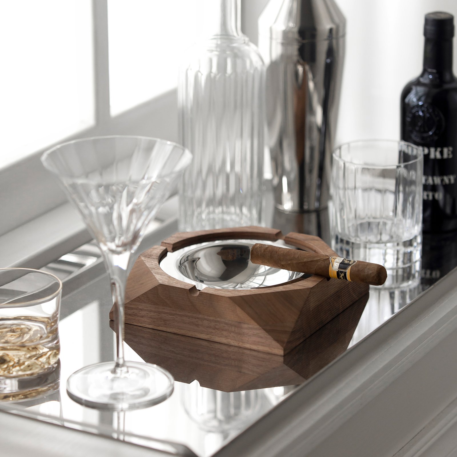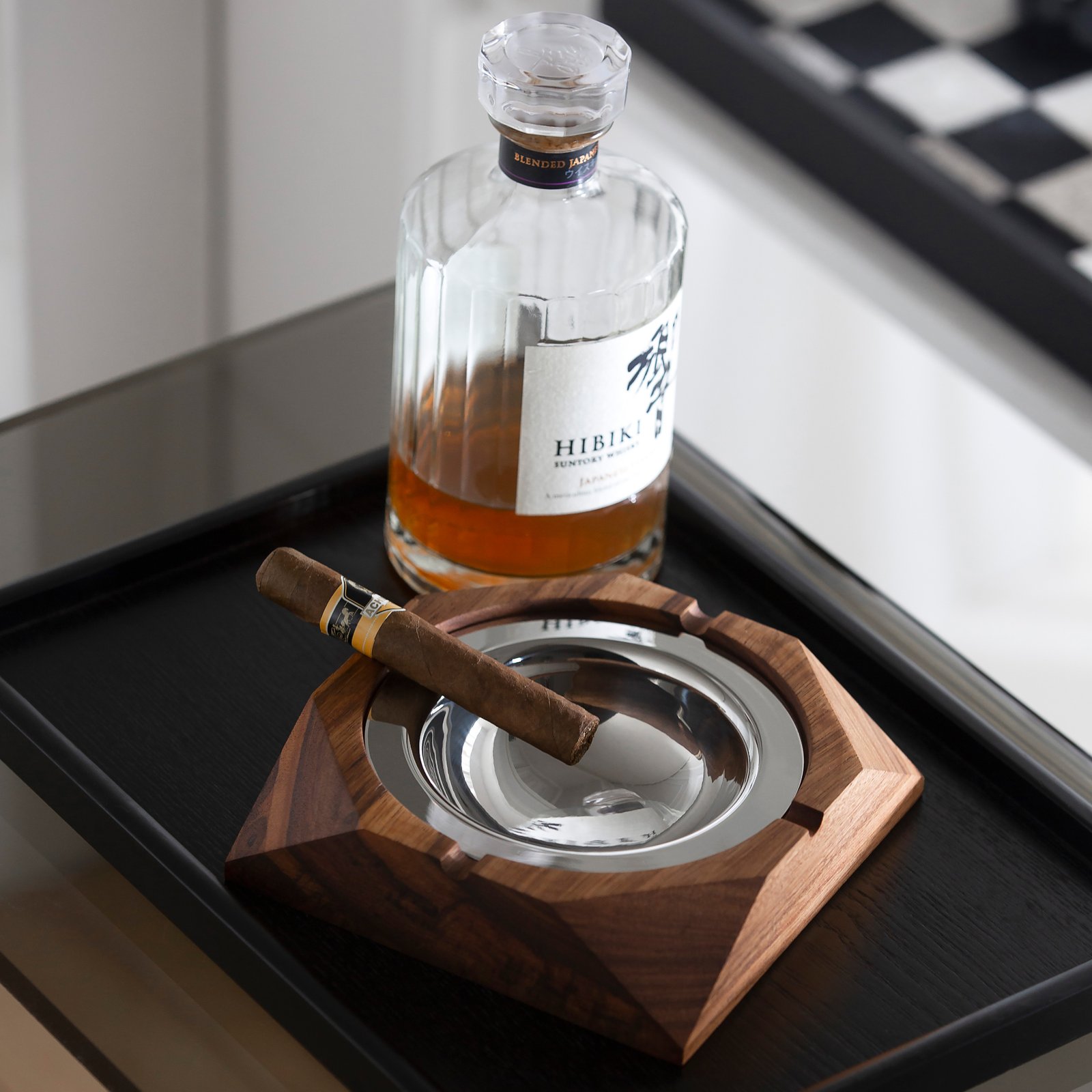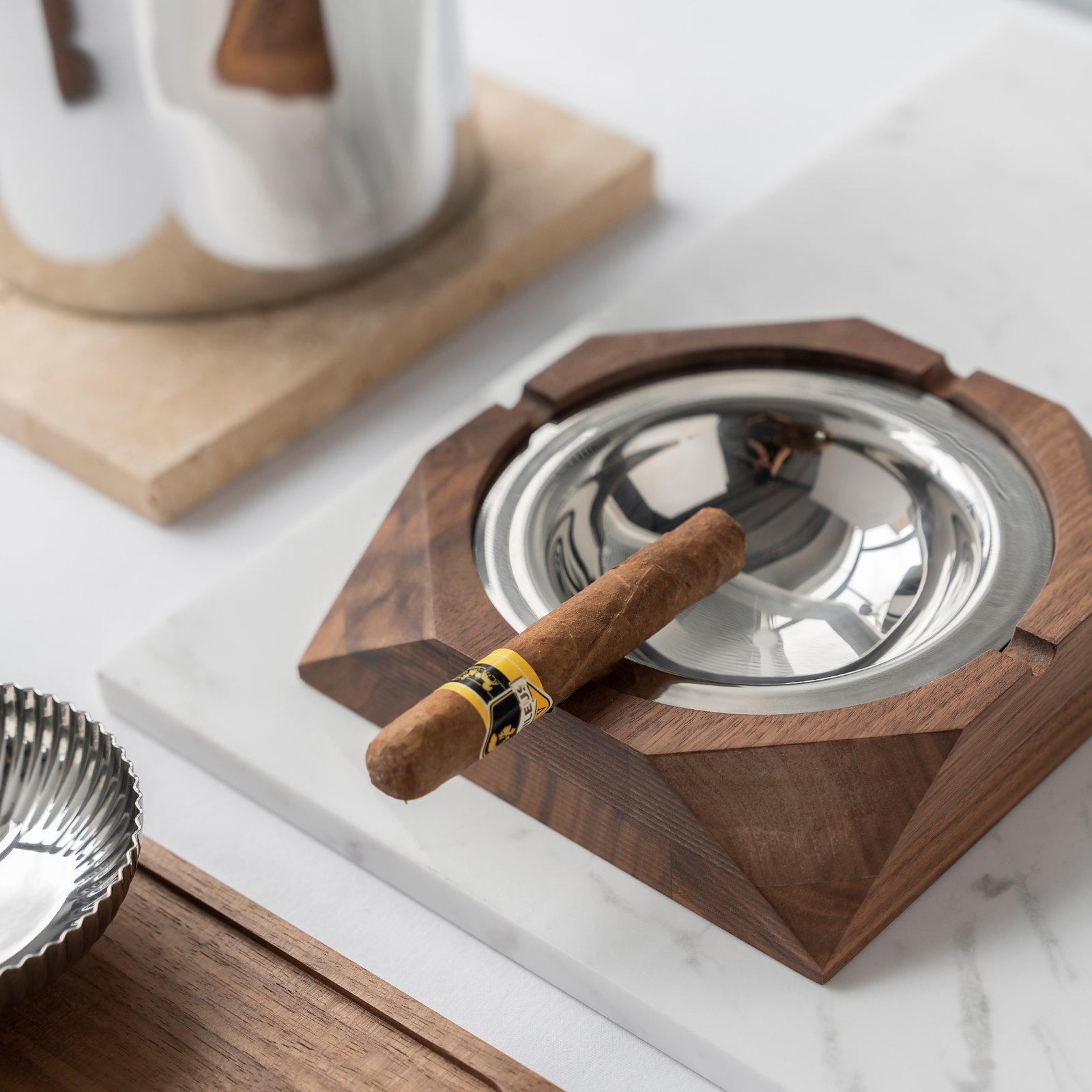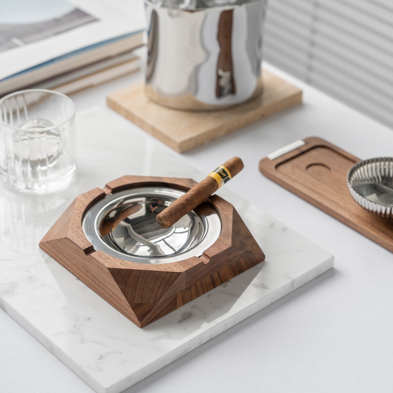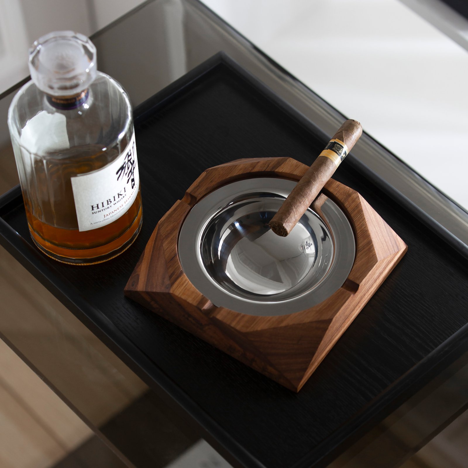 Creative walnut wood, light luxury, stainless steel ashtray, high-end feel, living room, office, cigar tray, cigarette extinguisher, home decoration and display item