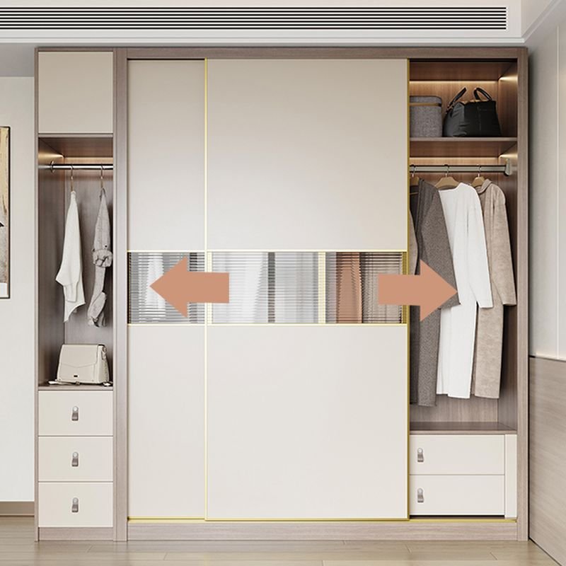 Chic Fluted Glass White Wardrobe with LED Lighting – Elegant 79″ to 94.5″ Sliding Closet with Side Drawers & 18 Styles