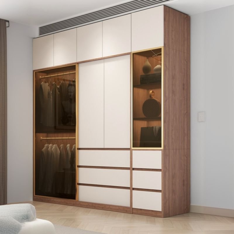 Illuminating the Interior: The LED Ambient Light Armoire What distinguishes a truly premium wardrobe is how it interacts with light. Our LED Ambient Light Armoire features integrated lighting strips that cast a soft, museum-quality glow over your garments. This light, diffused through our high-performance sliding glass panels, creates a sense of depth and luxury that opaque doors cannot match. It turns the act of getting dressed into a sensory ritual. When paired with our Tempered Glass Modular Closet technology, the unit doesn’t just store items; it showcases them, while the white top hinged doors provide a discrete vault for seasonal storage, balanced with standard cushioned hinges for silent operation.