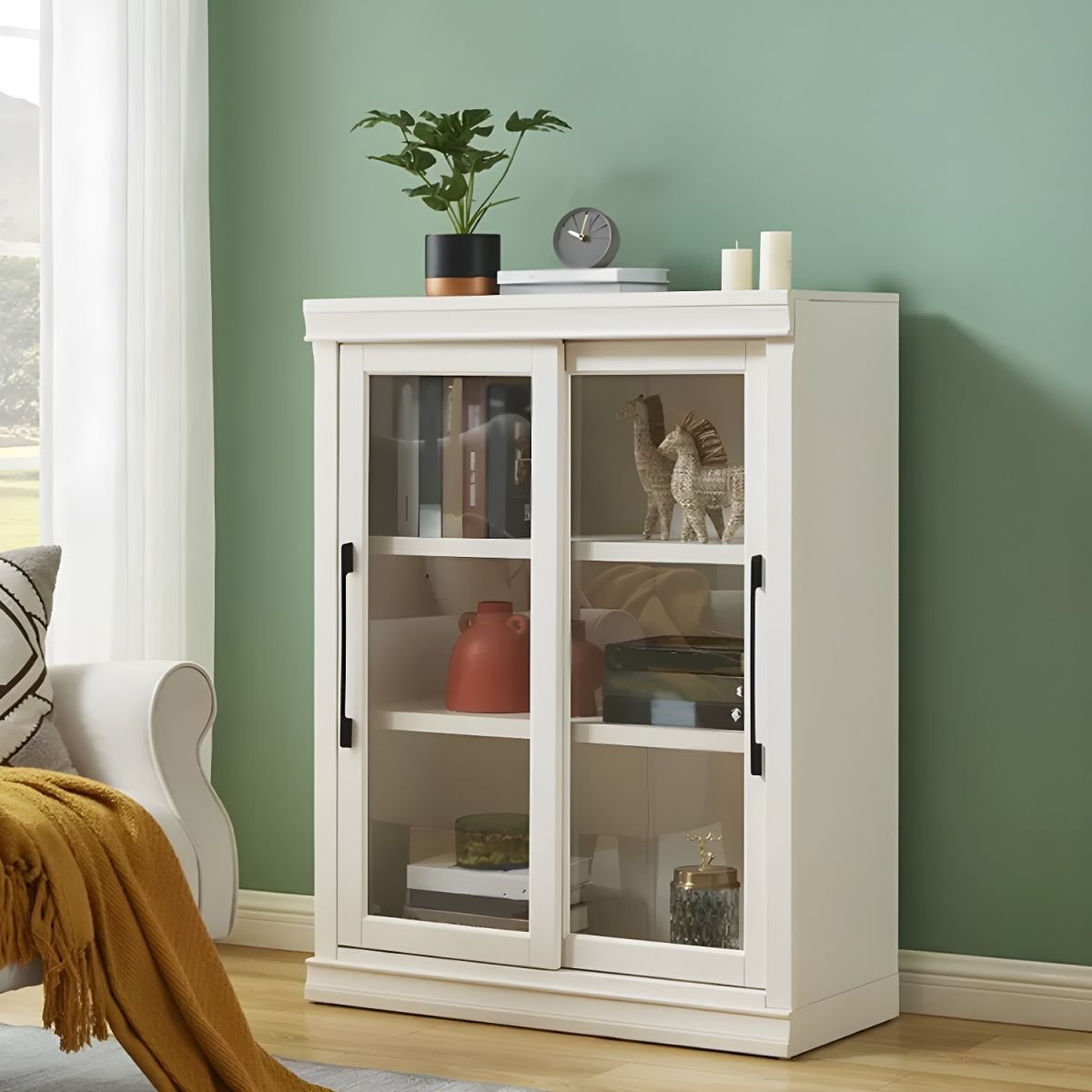 Graceful Minimalist White Sliding Door Wardrobe with Side Display Shelves – Versatile 71″ to 86.5″ Modular System in 18 Styles