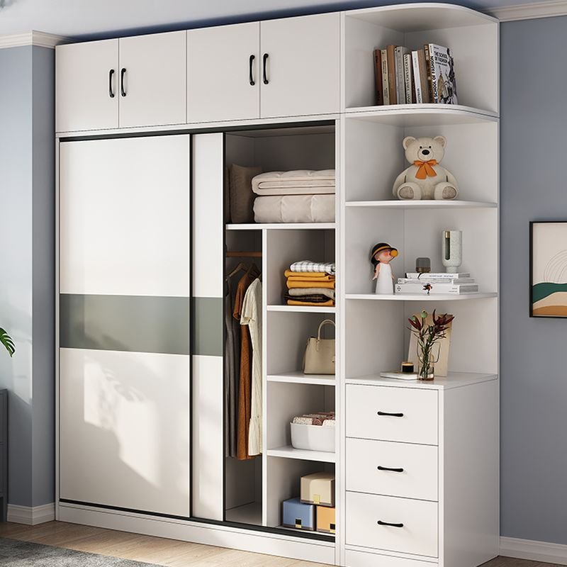 Graceful Minimalist White Sliding Door Wardrobe with Side Display Shelves – Versatile 71″ to 86.5″ Modular System in 18 Styles