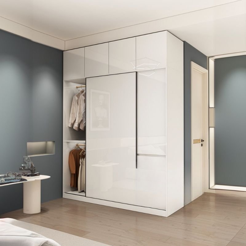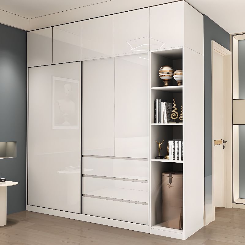 Graceful Minimalist White Sliding Door Wardrobe with Side Display Shelves – Versatile 71″ to 86.5″ Modular System in 18 Styles